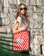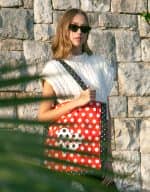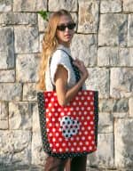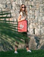 Nakupovalna bombažna torba z dvema dolgima ročajema. Kovinski magnet za pritrditev. Dimenzije 39 cm x 43 cm x 10,5 cm (širina x višina x globina). Ročaji 70 cm.