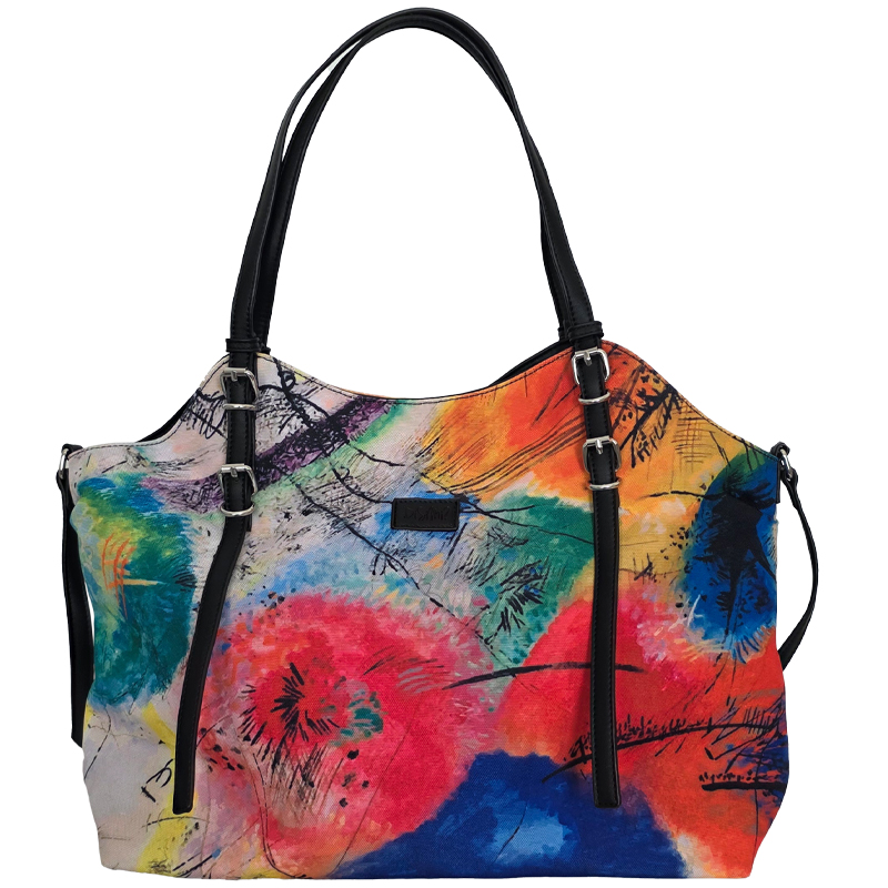 - Abstraktni potisk v živahnih barvah naredi torbo zelo moderno in edinstveno