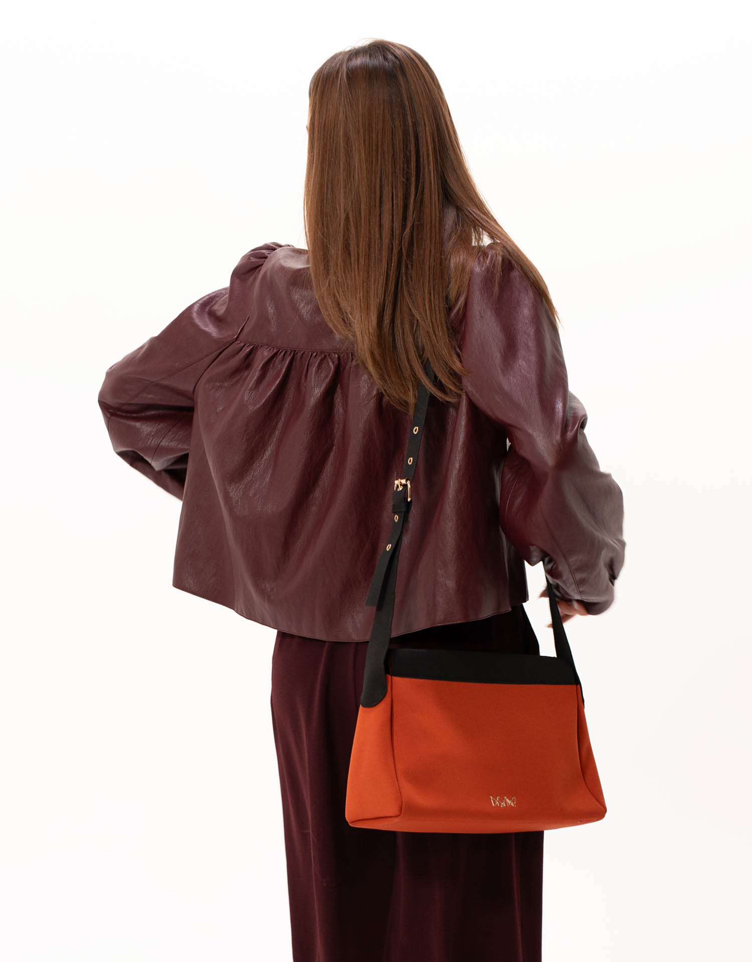 Ta torba je popolna kombinacija minimalističnega dizajna in praktičnosti. Izdelana je iz kakovostne tkanine, prihaja v topli “tangerine” barvi s črnimi detajli in zlatim napisom DiSiMi?, kar subtilno poudarja prepoznavnost blagovne znamke.